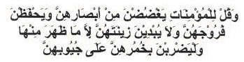“And tell the believing women to lower their gaze (from looking at forbidden things), and protect their private parts (from illegal sexual acts) and not to show off their adornment except only that which is apparent, and to draw their outer garment over their bosoms” [TMQ An-Nur: 31].