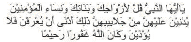 O Prophet! Tell your wives and your daughters and the women of the believers to draw their cloaks (veils) all over their bodies. That will be better, that they should be known (as free respectable women) so as not to be annoyed. And Allah is Ever Oft-Forgiving, Most Merciful” [TMQ Al-Ahzab: 59].