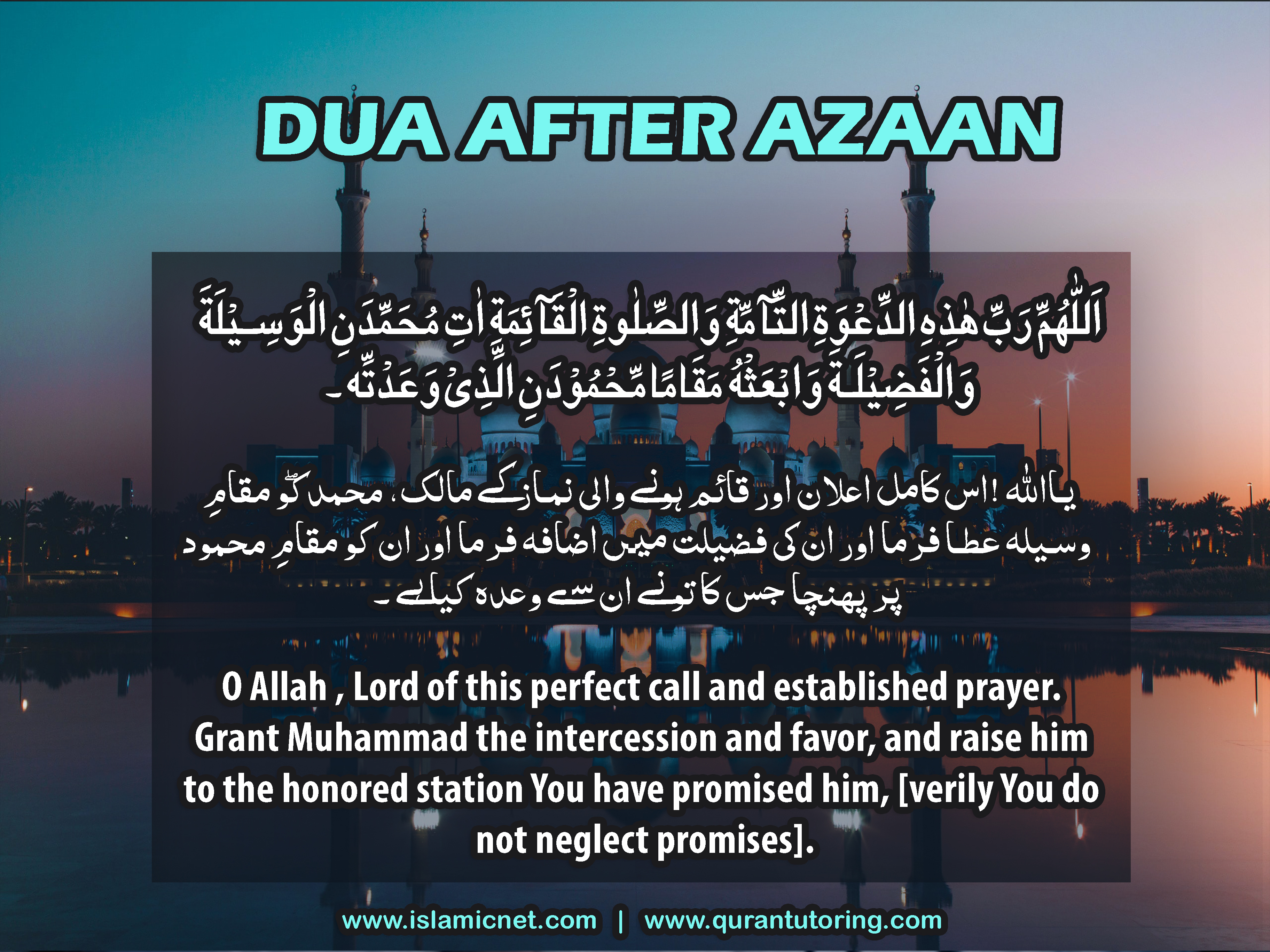 اَللّٰہُمَّ رَبَّ ھٰذِہِ الدَّعْوَةِ التَّآمَّةِ وَالصَّلٰوةِ الْقَآئِمَةِ اٰتِ مُحَمَّدَنِ الْوَسِیْلَةَ وَالْفَضِیْلَةَ وَابْعَثْہُ مَقَامًا مَّحْمُوْدَنِ الَّذِیْ وَعَدْتَّہ ۔